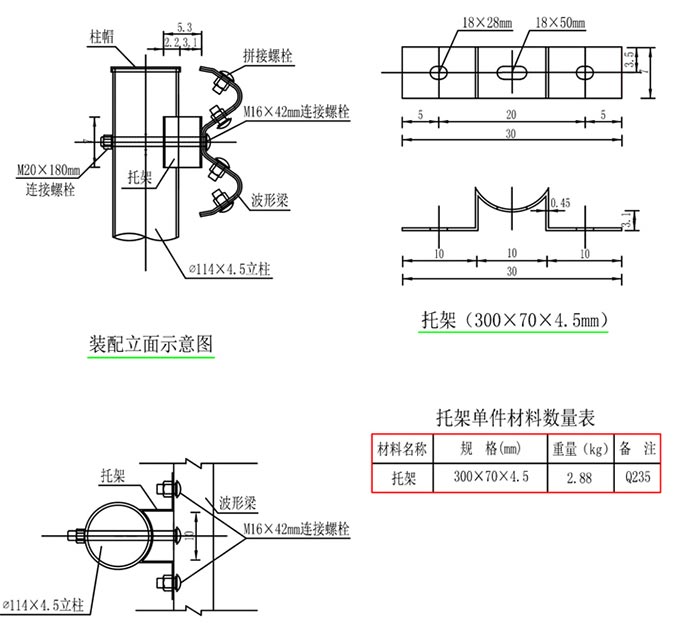 a)托架的规格:300*70*4.5 R=57b)与Φ114钢管立柱配套使用